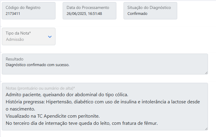 Após a integração das notas selecionadas, o sistema processará automaticamente o conteúdo clínico e gerará os diagnósticos correspondentes, incluindo CID Principal, CIDs Secundários e Condições Adquiridas.