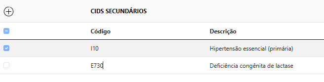 Além do CID Principal, o sistema pode apresentar uma lista de CIDs Secundários sugeridos, de acordo com o conteúdo clínico da nota inserida. Veja o exemplo: